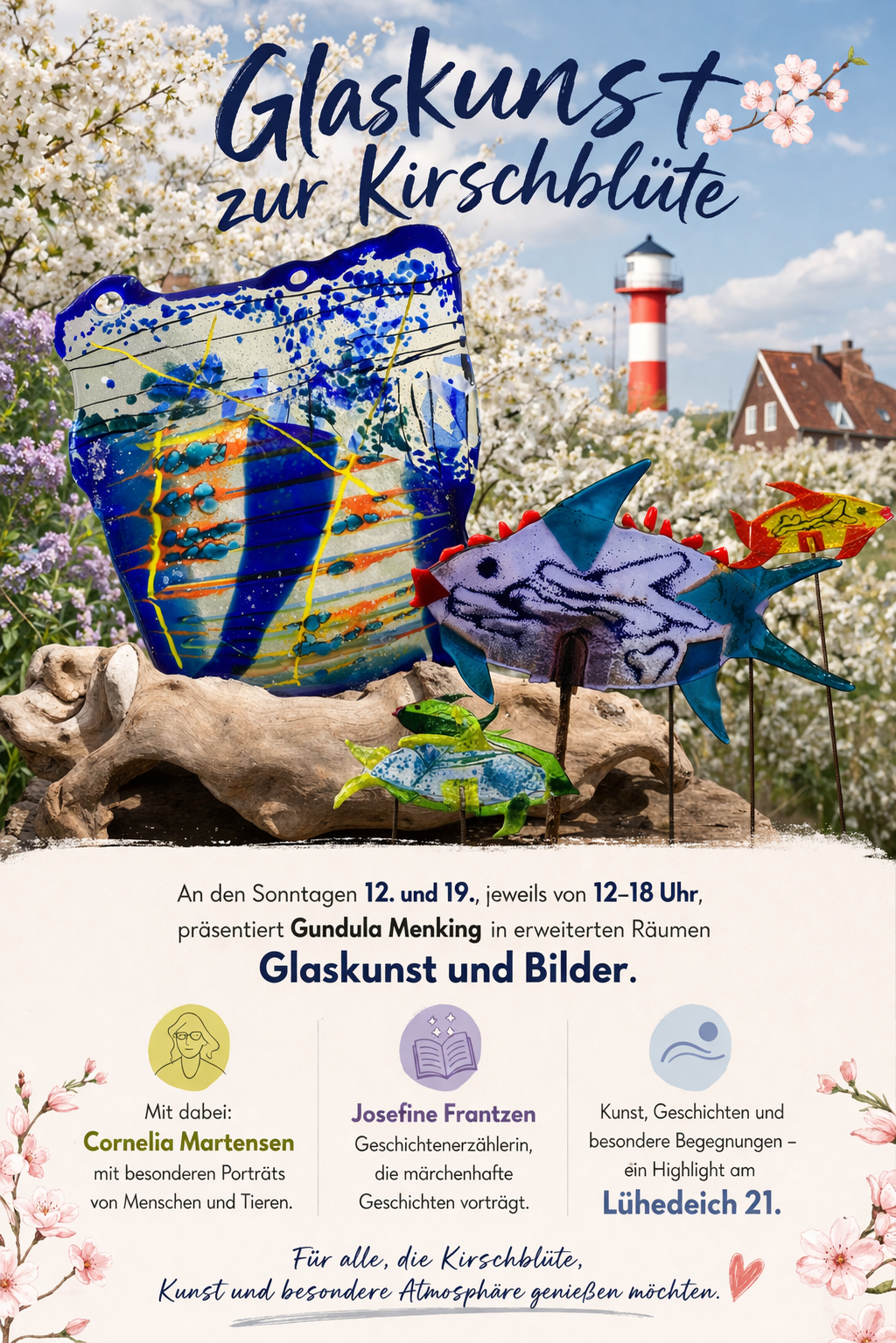 Am kommenden Wochenende, 18. und 19. April 2026, wird auf dem Lühedeich in der Galerie Glas und Meer wieder ein zauberhaftes Programm in erweiterten Räumen präsentieren.